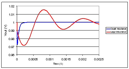 图 2 对小和大互连电感的负载瞬态期间的输出电压变化模拟情况进行了比较。小电感响应快速渐次减弱,而大电感则并非如此,花费了较长的时间才稳定下来。这是由于特性阻抗更高以及谐振频率更低。另外,如果负载电流在该谐振频率有规律地跳动,则会出现极宽且具破坏性的电压变化。
