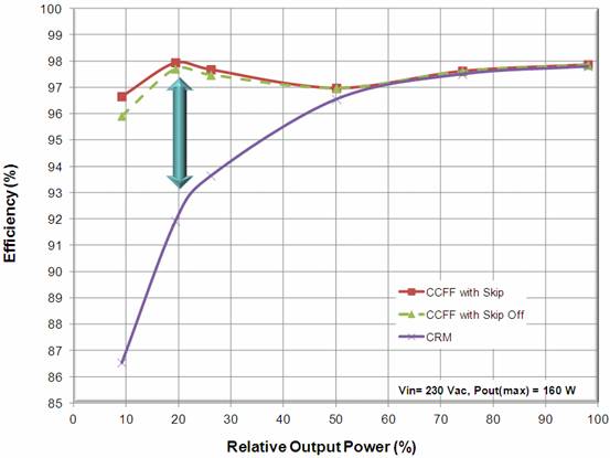 采用CCFF控制架构,最大的好处莫过于提升能效。采用传统CrM(临界导电模式)/BCM(边界线导电模式),在负载降低时,开关频率上升;负载极低时,控制器可能进入“跳周期模式”,滋生可听噪声。而采用CCFF控制架构,可以在负载降低时降低开关频率,减小功率损耗;在轻载时,控制器可以钳位高于可听噪声频段的较低频率;负载极低时,则采用跳周期模式工作(可以轻易关闭)。因此,这种谷底导通可进一步提升能效,减小电磁干扰。图4比较了基于NCP1611CCFF PFC及传统CrM PFC在不同负载条件下的能效。由图中可见,在10%轻载条件下,基于带跳周期模式的NCP1611的演示板的能效高达近97%(关闭跳周期模式下也达近96%),而基于传统CrM架构的演示板能效仅为近87%,相关近10%。可见NCP1611在提升电源轻载能效方面表现尤为优异。