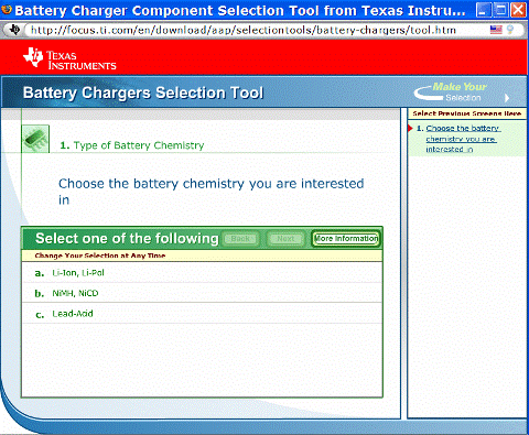 电池充电器工具使得设计人员选择正确的充电器的过程更轻松。图 3 是 TI 网站上提供的一种工具的示例。