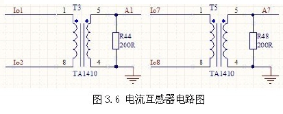 此系统输出电流小于1A,故选择最大可以测量1A 的电压型电流互感器TA1410,负载电阻用是200欧,输出电压为-1~1V 的交流电压。电路如图3.6 所示。