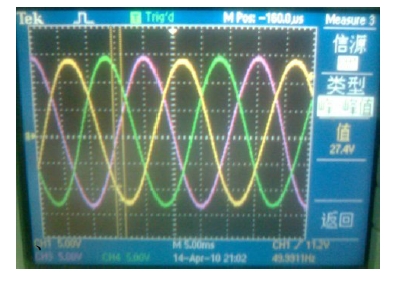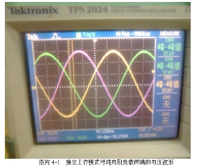 光伏并网发电系统要实现并网,必须使逆变输出与电网电压的幅度、相位与频率达到一致,否则将会使电网谐波增加、电能质量下降,并产生并网环流,甚至造成光 伏发电系统的损坏。因此在并网过程中必须进行同步锁相控制、输出电压幅度控制以满足并网的要求。根据IEEE Std 1547-2003 规定最大相位误差为20 度,瞬时电压误差不能超过电网电压的10%、最大频率误差不能超过0.3Hz。图片4-1为独立工作模式时纯电阻负载两端的电压波形。