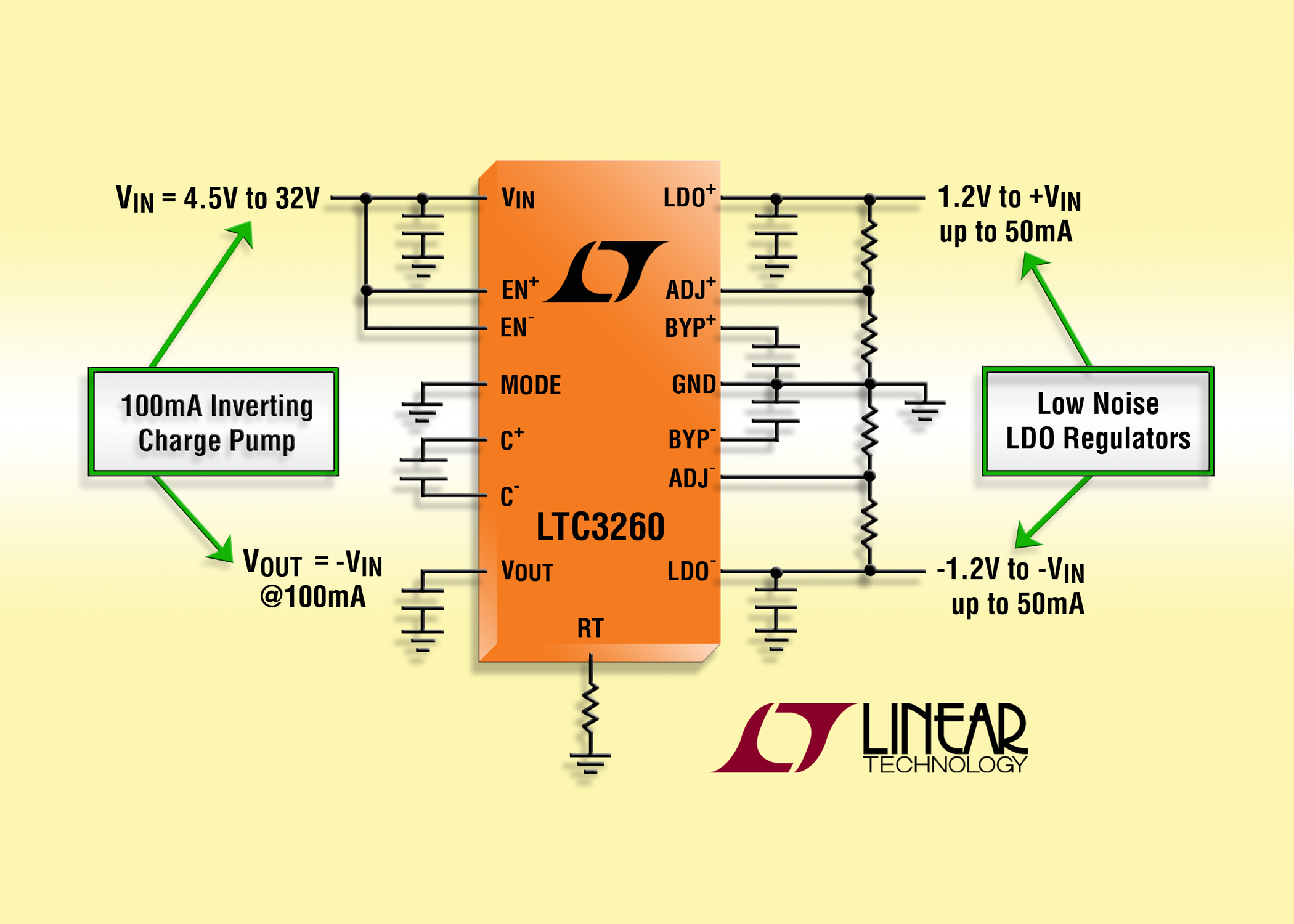 加利福尼亚州米尔皮塔斯 (MILPITAS, CA) – 2012 年 5 月 10 日 – 凌力尔特公司 (Linear Technology Corporation) 推出通用高压充电泵 LTC3260 和 LTC3261。LTC3261 是高压负输出充电泵,可提供高达 100mA 的输出电流。LTC3260 具有与 LTC3261 相同的充电泵,但还包括两个正及负 LDO 稳压器,每个 LDO 稳压器可提供高达 50mA 的输出电流。负 LDO 后置稳压器由负输出充电泵的输出供电。正和负 LDO 输出电压可用外部电阻器分压器分别调节至 1.2V 和 -1.2V。两款器件均在 4.5V 至 32V 的宽输入电压范围内工作。