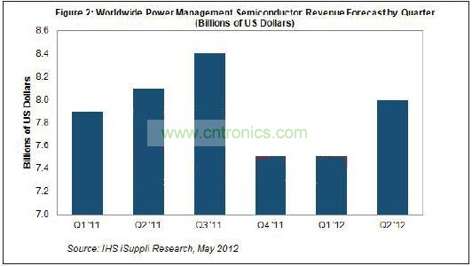 据IHS iSuppli公司的电源管理市场追踪报告,继2011年第四季度惨跌之后,电源管理半导体在2012年初有所回升,并在第二季度终于走上明显增长之路,主要是受消费与工业领域的扩张推动。