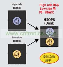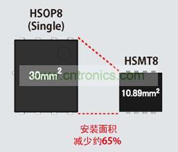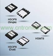 根据不同用途,提供3种小型封装。HSMT8比HSOP8的安装面积减少了65%,为节省空间做出巨大贡献。而且,产品阵容中还包括DC/DC电源电路中的高边(High Side)用MOSFET与低边(Low Side)用MOSFET复合化的新封装HSOP8(Dual)。不仅安装面积减小,而且还可有助于减少安装次数。