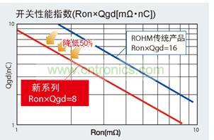 进一步微细化,同时,采用罗姆独家的低容量构造和新的“沟槽式场板结构”,实现了低容量与低导通电阻兼备的元件。与罗姆传统产品相比,表示功率MOSFET的性能指数的“FOM”数值可降低50%。