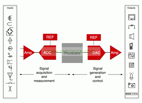 图 1 所示结构图可代表信号处理的所有系统。如果它是一个测量或者数据采集系统,则信号链开始于传感器,经过信号调节电路,进入一个 ADCr,然后结束于处理器。如果它是一个控制系统、一个音频处理系统亦或是一个软件定义无线电设备则可能存在一些必须变回到模拟信号的处理器输出;这种情况显示在结构图的右手侧二分之一处。