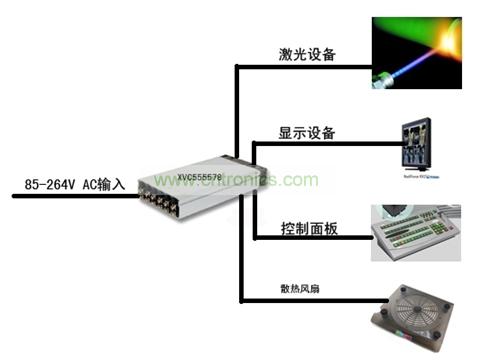 一台癌症治疗设备主系统需要155V的内部电压供应,且需得到医疗认证,18V的显示器,48V的马达及12V+5V的控制面板。该设备由于电压需求特殊,曾经采用的电源系统需要专门开发,相当复杂而且价格高昂,所以选择Excelsys的两个不同型号的机壳配合使用。先选择一台符合医疗设备安规标准的 XMC5550的电源将三个Xg5??榇涑鲆桓?55V的电压为设备主系统供电,其次选择一台普通工业电源XLC5780用于显示器、马达及控制面板供电。如此复杂的系统这样就搞定了,成本远低于以前的设计方案。