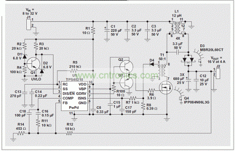 就非耦合电感设计而言,33-µH Coilcraft SER2918用于L1,而22-µH Coiltronics HC9 则用于 L2。它们的选择均基于绕组电阻、额定电流和尺寸。选择电感时,设计人员必须注意还要考虑铁芯和 AC 绕组损耗。这些损耗可降低电感的有效DC电流,但并非所有厂商都提供计算所需的全部信息。错误的计算结果,会大大增加铁芯温度,使其超出典型的 40°C 温升。它还会降低效率,并且加速过早失效现象的出现。