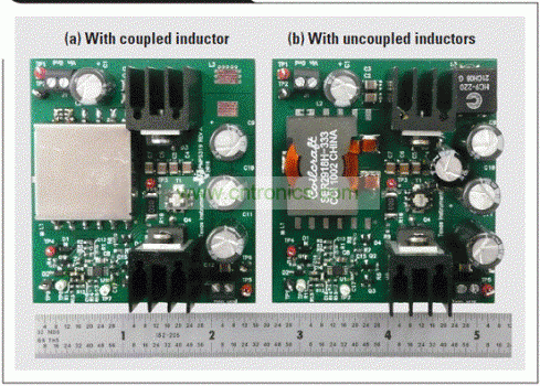 图 2 显示了使用一个耦合电感的原型 SEPIC的 示意图。若想在设计中实施非耦合电感,只需在相同 PWB 上用两个电感替换耦合电感便可。图 3 显示了两种原型电路。图 3b 中,L1 占用了耦合电感的空间,而 L2 则位于右上角。