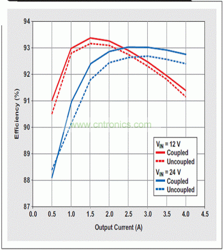 图 4 耦合和非耦合电感均获得了较好的效率