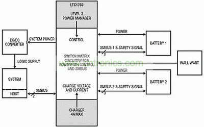 LTC1760加上一些智能电池和一个AC适配器,就可组成一个简单系统。系统结构如图3所示。