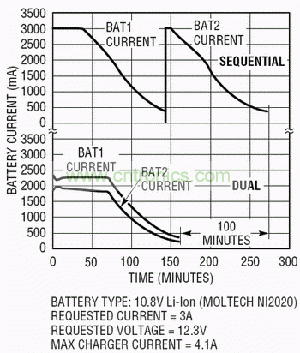 传统上,双电池系统是顺序放电系统,允许顺序消耗电池电量(先消耗电池1,再消耗电池2),以简单地延长总的电池工作时间。LTC1760采用了专有模拟控制技术,可允许安全地对两个电池并行充电或放电。图1是一个采用LTC1760的双电池系统的简化原理图。这种结构使充电速度提高了50%,电池工作时间延长了10%。此外,并行放电不仅增强了电流能力,而且还降低了I2R损耗并改善了在极高负载条件下的电压调节能力。降低I2R损耗和改善电压调节都延长了时序解决方案的总放电时间(见图2)。