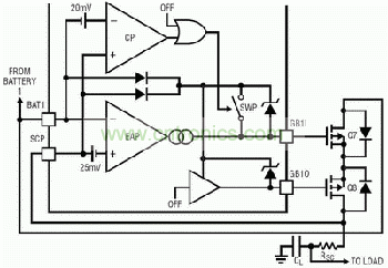 每条电源通路都由两个背对背的PFET组成,这两个PFET与短路检测电阻RSC串联。电池电源通路(PowerPathTM)开关驱动器等效电路如图 5 所示。