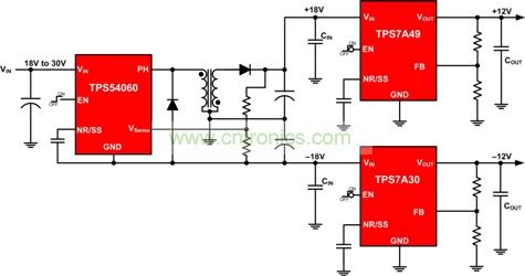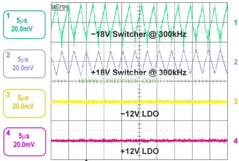 要创建这种参考设计,需使用一个降-升压结构的 +60V 开关转换器来产生一个平衡的+/-输出电压。利用低噪声、高 PSRR LDO(例如:TPS7A30 和 TPS7A49 等),对开关的正负电压输出进行后期稳压。图 2 中,–18V 轨的开关稳压器电压纹波为约 40mV,而 +18V 轨则为 20mV。通过使用 LDO 对 300 kHz 开关稳压器的输出进行后期稳压,电压纹波得到极大减弱。这里,我们使用 60V 开关转换器,因为接地引脚参考至 –18V 轨,并且最大 VIN为 30V。在这种配置中,开关转换器必须承受的最大电压为 48V。请为其宽输入电压、低输出噪声和高 PSRR 选择 LDO。