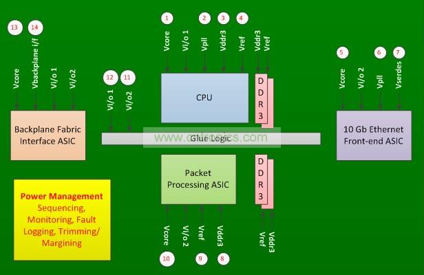 在图1所示的线卡中,有四个主要的集成电路和一些粘合逻辑。每个集成电路都需要多个电源,并有定序的要求。这块电路板有14个电源电压,需要进行监测、定序、微调和裕度调整。此外,电路板的设计还需要将任何意想不到的电源故障记录在非易失性存储器中。