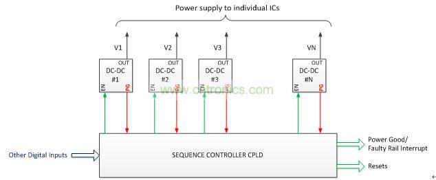 一个实现复杂的电源管理的常用方法(图2)是使用DC-DC转换器的电源良好信号,以监测这个电源,并使用CPLD来实现定序算法(控制DC-DC转换器的使能信号)。CPLD也产生监测信号,如电源就绪/故障电压中断和复位信号。