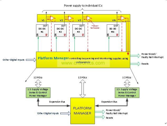 要求CPLD对电路板上超过12个电压实现电源管理功能,如定序,复位产生等功能。这些设计取决于电路板上按装的DC-DC转换器产生的电源良好信号,用以监控这些电压。然而,精度差的这些电源良好信号会导致电路板功能的可靠性大大降低。增加电路板的可靠性可以通过用精确的比较器替代这些电源良好信号,监控DC-DC转换器的实际输出电压。
