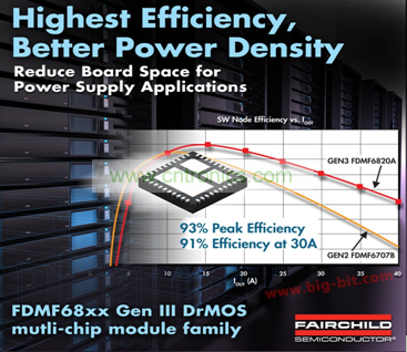 当能效标准逐渐成为电子产品新的紧箍咒,各大电源半导体厂商不得不面对电源管理技术的全新挑战。飞兆半导体 FDMF68xx Gen III DrMOS多芯片???MCM)系列经设计能够降低输出感量和减少输出电容器数目,与普通分立器件解决方案相比,该系列能够节省多达50%的线路板空间,并提高效率,以期满足新能源标准要求。使用飞兆半导体的高性能PowerTrench® MOSFET技术,FDMF68xx系列能够显着减少开关振铃(switch ringing),省去大多数降压转换器应用中使用的缓冲器电路。FDMF68xx系列配合针对刀片式服务器、高性能笔记本电脑、游戏主机和负载点(point-of-load)??榈男履茉幢曜己拖低彻娣叮谕贫到缍愿咝?、更大电流、更高开关频率以及更大功率密度的需求。