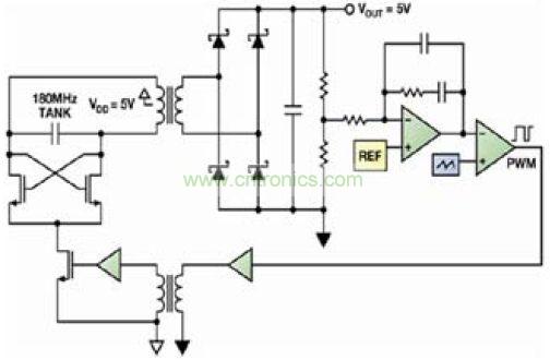 的其他数据通道信号相同。当为能量转换和反馈设置不同的控制路径时,可以优化能量转换效率,同时维持调节的稳定性。图2(b)展示的是带四个独立的隔离数据通道的500 mW隔离dc-dc转换器。