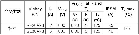 导读:Vishay近日推出新款通过AEC-Q101认证并具有ESD?;さ?00V标准整流器SE20AFJ和SE30AFJ。该款高电流密度器件通过AEC-Q101认证,具有高达3A的正向电流。