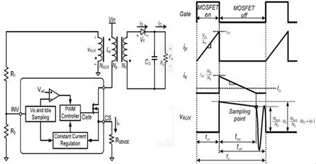 表示,由此可知,在去磁结束时间点,次级绕组输出电压与辅助绕组具有线性关系,只要采样此点的辅助绕组的电压,并形成由精确参考电压箝位的误差放大器的环路反馈,就可以稳定输出电压VO。这时的输出电流IO由公式