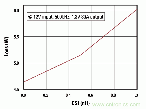 图1为具备杂散电感和电阻(由封装键合线、引线框以及电路板布局和互连线带来)等寄生效应的半桥电路。共源电感(CSI)倾向于降低控制FET(高边FET)的导通和关断速度。如果与栅极驱动串联,通过CSI的电压加至栅极驱动上,可使FET处于导通状态(条件:V = -Ldi/dt),从而延迟晶体管的关断。这也会增大控制FET的功耗,如图2所示。