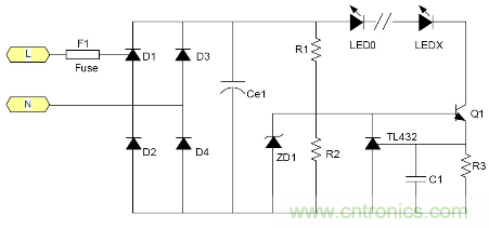 C1为降压电容器, D1, 2, 3, 4为桥式整流二极管, ZD1是稳压二极管, R1为关断电源后C1的电荷泄放电阻。