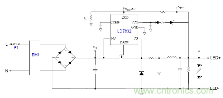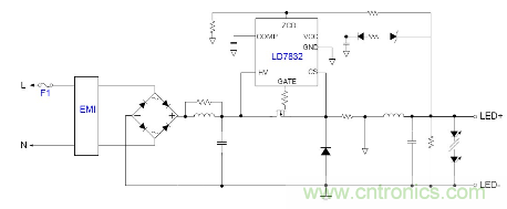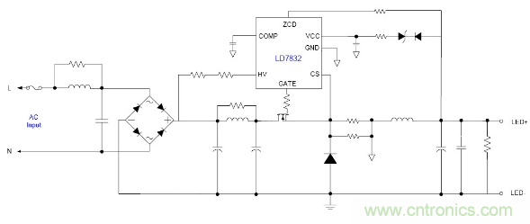 随着目前法规和能效的需求, 针对LED应用提出高PF以及适应全电压范围都能可靠工作的要求, 并且朝小型化方面发展, 因此之前的填谷式的PFC电路也需要增加两个高压电容因体积的限制不太适合应用。有鉴如此, 国内外很多厂商都推出了适应球泡灯和T管之类的非隔离电源应用驱动方案, 下面就以通嘉科技的LD7832做为典型介绍。
