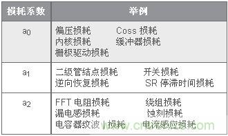 表1概括总结了各种电源损耗项及其相关损耗系数,该表提供了一些最佳化电源效率方面的折中方法。例如,功率MOSFET导通电阻的选择会影响其栅极驱动要求及Coss损耗和潜在的缓冲器损耗。低导通电阻意味着,栅极驱动、Coss 和缓冲器损耗逆向增加。因此,您可通过选择MOSFET来控制a0和a2。