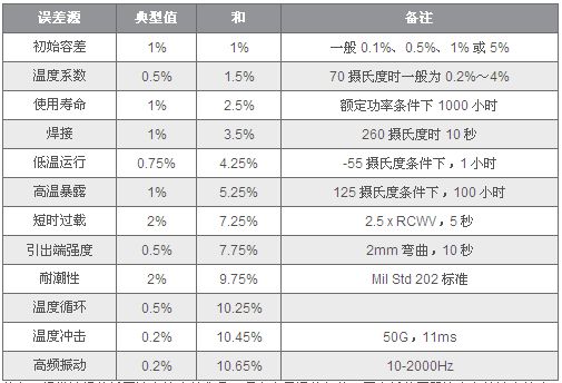 有趣的是,这样给低压输出带来了更高的精度。许多IC参考电压范围为0.6~1.25 V之间,输出电压降至这一范围时会带来1%或更高的精度。表1给出了您可能需要了解的一些信息,这些信息是典型电阻器产品说明书的电阻误差术语汇编。在设计中,该列表会较难理解。大多数工程师都止步于初始容差,然而列表中还有一些或许不应被忽略的误差项。表格中的每一项都有其微妙的影响。例如,没有指定具体的温度系数范围,而实际上两个电阻都可能随温度变化以相同方向变化,并且不会在相反的极端。在对一些经验丰富的设计工程师进行简单调查后,得出的结论是假设1%容差电阻的2.5%精度可在极端情况和合理成本之间得到一个合理的折中方案。