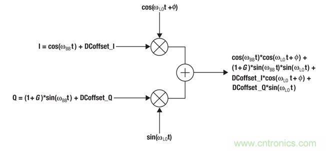 DC 偏移会与 LO 混频,产生 LO 馈通,即?LO的频率。I和Q分支的DC偏移加入正交,形成以下的LO馈通振幅:
