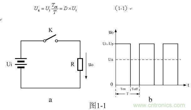 图1-1-b是串联式开关电源输出电压的波形,由图中看出,从控制开关K输出电压uo是一个脉冲调制方波,脉冲幅度Up等于输入电压Ui,脉冲宽度等于控制开关K的接通时间Ton,由此可求得串联式开关电源输出电压uo的平均值Ua为: