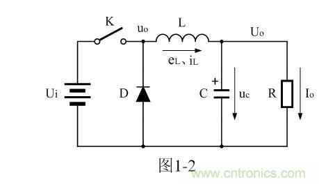图1-2是在图1-1-a电路的基础上,增加了一个整流二极管和一个LC滤波电路。其中L是储能滤波电感,它的作用是在控制开关K接通期间Ton限制大电流通过,防止输入电压Ui直接加到负载R上,对负载R产生电流冲击;同时,流过电感的电流iL又会转化成磁能,并存储于电感之中,然后在控制开关K关断期间Toff电感又会把磁能转化成电流iL继续向负载R提供能量输出。因此,图1-2中的L是一个储能滤波电感,它对流过电路中的电流起到平滑滤波的作用。
