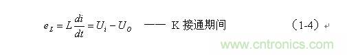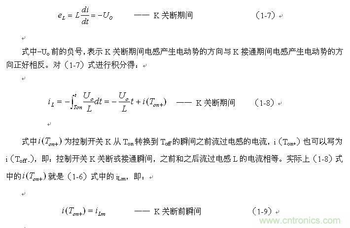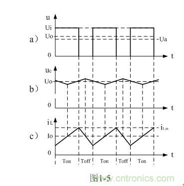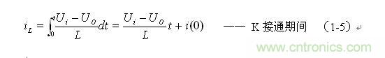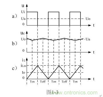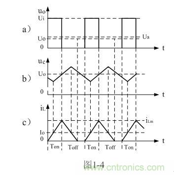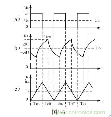 在此顺便说明:由于电容两端的电压变化量ΔU相对于输出电压Uo来说非常小,为了简单,我们这里把Uo当成常量来处理。在某种情况下,当我们需要对电容的初次充、放电过程进行分析时,必须需要建立微分方程,并求解。当开关电源刚开始工作时,由于输出电压Uo的建立需要一定的时间,因此,输出电压Uo的建立也需要一个过渡过程,如对此过渡过程进行精确计算,得出的结果中一般都含有一指数函数项,当令时间变量等于无穷大时,即电路进入稳态时,再对相关参量取平均值,其结果就基本与(1-4)相等。