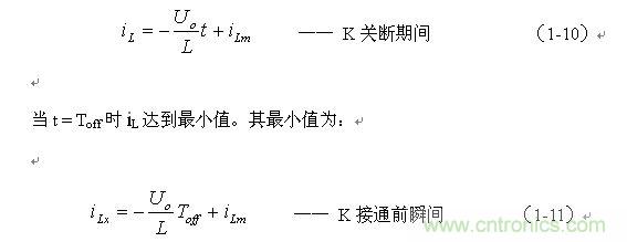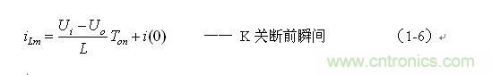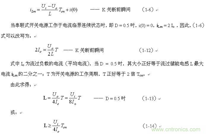 串联式开关电源最好工作于电流临界连续状态,或连续电流状态。此时,开关电源输出电压的调整率为最好,且输出电压Uo的纹波也不大。因此,我们可以从电流临界连续状态着手进行分析。我们先看(1-6)式: