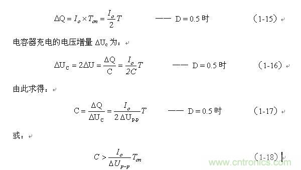 (1-17)和(1-18)式,就是计算串联式开关电源储能滤波电容的公式(D = 0.5时)。式中:Io是流过负载的电流,T为控制开关K的工作周期,ΔUP-P为输出电压的波纹。电压波纹ΔUP-P一般都取峰-峰值,所以电压波纹正好等于电容器充电或放电时的电压增量,即:ΔUP-P = ΔUc 。
