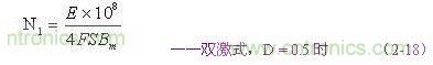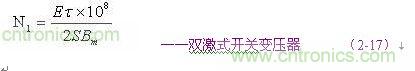 (2-17)和(2-18)式,为计算双激式开关变压器初级线圈N1绕组匝数的公式。式中,N1为变压器初级线圈N1绕组的最少匝数,S为变压器铁芯的导磁面积(单位:平方厘米),Bm为变压器铁芯的最大磁感应强度(单位:高斯),τ为脉冲宽度,或电源开关管的导通时间(单位:秒),E为脉冲电压的幅度,单位为伏,F为开关电源的工作频率,单位赫芝。