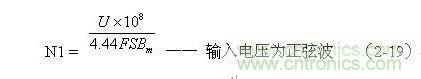 (2-19)式为计算正弦波电源变压器初级线圈N1绕组匝数的公式。式中,N1为变压器初级线圈N1绕组的最少匝数,S为变压器铁芯的导磁面积(单位:平方厘米),Bm为变压器铁芯的最大磁感应强度(单位:高斯),U为正弦波输入电压有效值,单位为伏,F为正弦波的频率,单位赫芝。