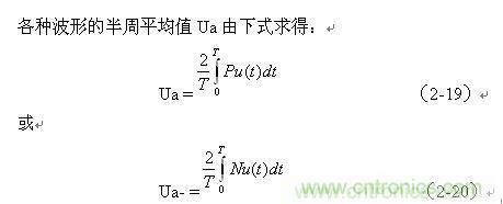 (2-19)、(2-20)式中,Ua和Ua-分别为各种波形的正、负半周平均值,Pu(t)和Nu(t)分别为各种波形的正波形函数(正半周)和负波形函数(负半周),T为所选波形的周期。大部分交流电压波形,其正、负半周平均值的绝对值都相等,但符号相反。