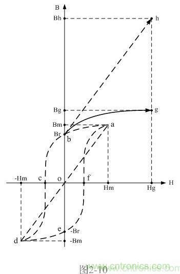 在图2-10中,虚线表示的磁化曲线a-b-c-d-e-f-a为双激开关变压器铁芯正常工作时的磁滞回线,虚线线段d-a是把开关变压器铁芯的磁化曲线理想化后得到的一条曲线(直线),理想磁化曲线是一条斜率等于最大磁感应强度增量与最大磁场强度增量之比,且经过坐标原点的直线;当直线不经过坐标原点时,这条直线可称为等效磁化曲线(如线段bh)。理想磁化曲线只有一条,但等效磁化曲线却有无数多条,且每条效磁化曲线均与理想磁化曲线平行。