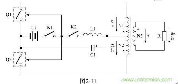 在图2-11中,开机时,驱动电路电源开关K1首先接通,电源Ui首先给电源开关管Q1、Q2的驱动电路加电;然后开关管电源开关K2接通,由于L1的作用,C1两端的电压只能缓慢上升,以保证加到变压器初级线圈的电压不会突然升高,使流过变压器初级线圈的电流过大,导致变压器铁芯出现饱和;关机时,开关管电源开关K2首先关断,而后驱动电路电源开关K1再关断,由于C1两端的电压缓慢下降,使变压器铁芯可进行充分退磁,以保证下次开机的时候,变压器铁芯磁滞回线的初始相位总是从0开始。