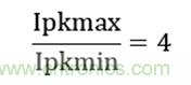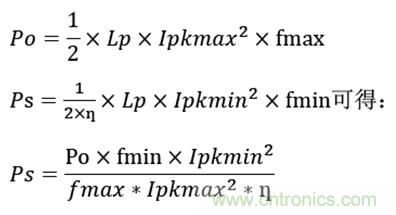 由上式可得,待机功耗的大小跟变压器电感量大小,变换器具体的峰值电流无关,只与设计的最高工作频率与芯片最低工作频率比以及最大设计峰值电流和最小峰值电流比有关。根据芯片规格书得: