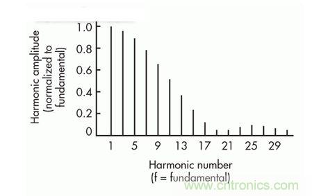 非线性负载可使谐波大小与线路频率下的基本谐波电流具有可比性。图4显示了相对于线路频率下的基本谐波大小进行标准化的高阶谐波电流大小。不过,只有图1中给出的在与线路频率相同的频率下且与电源线电压同相的谐波电流(在此案例中为线路频率下的基本谐波)对提供给负载的平均功率起作用。这些谐波电流会影响同一电力线上的其他设备的工作情况。
