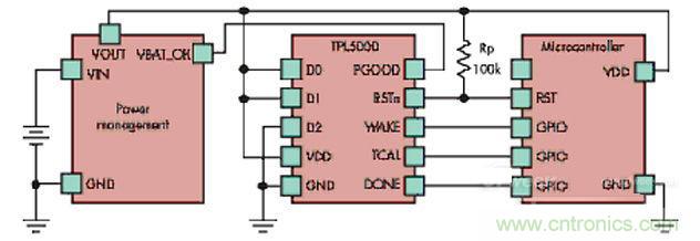 新式解决方案采用针对长休眠期特制的定时装置,德州仪器TPL5000具备可编程分配器,提供最高间隔64秒的苏醒脉冲,运作时用电量仅30nA,在极长休眠周期下,最多能为电池供电的无线传感器延长两年使用年限。(请见下图)