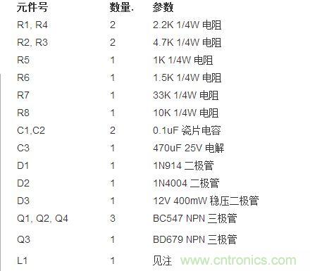 这个逆变电路可以提供高达800mA 12V电源。该电路简单,效率约为75%。通过改变只是一些组件,还可以修改不同的电压。该电路也适用摩托车音响等。