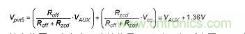 然后,施加在引脚5上的电压就为偏置。事实上,这就像是VAUX电压与减小了1.36V的ZCD阈值比较。这样一来,新的实际ZCD阈值就是: