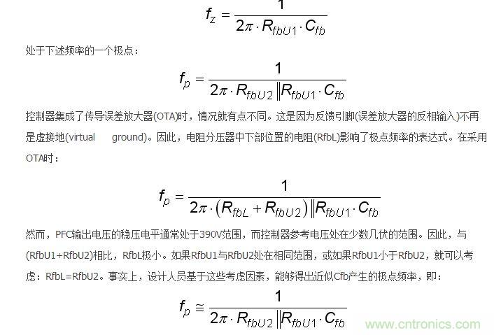 如果RfbU1与RfbU2处在相同范围,低频增益就略微增加,交越频率就跟随fp与fz的相同比率增加。如果与RfbU2相比RfbU1极小,我们就获得在控制至输出传递函数中抵消(cancel)的极点和零点。这样,增加Cfb就对环路和交越频率没有影响。事实上,特别是在RfbL=RfbU2时,这个增加的电容并不会大幅改变PFC段的动态性能。
