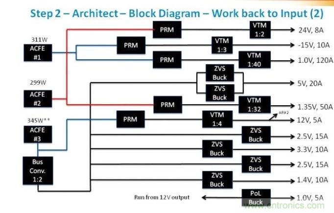 构建系统的第一个步骤是创建一个电源系统的方框图,从输出开始,然后向输入后向推进。从最低功率级别开始它的运作更好,并从那里继续工作,以便可以审查功率元件类别,并随功率级别的增加在必要时做出改变。