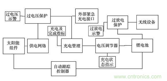现有的光伏电池,单体的输出电压都很低(在1V 以下) ,本设计中,将多个光伏电池相串联,组成太阳能组件。通过可以自动调节占空比的供电网络保证在光照强度变化和负载变化时,输出电压基本稳定,为充电管理芯片提供稳定的电压输入。通过对供电网络的副边电压监测,保护充电管理芯片不因电压过高而损坏。通过对电池两端的电压监测,保证锂电池不会因过放电而损坏。由于无线示功仪及其中继网络节点的供电要求是313V,采用低噪声、高速度的CMOS型电压调节器。在自动跟踪控制器作用下,始终保持全天候跟踪太阳。为了防止因连续阴雨天而导致的太阳能供电不足,设计应急充电电路,充电期间,无线示功仪及其节点正常运行。具体系统设计??槿缤? 所示。