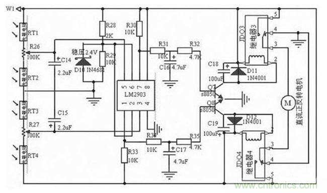 控制器的输入端,光敏传感器分别由两只光敏电阻串联交叉组合而成。每一组两只光敏电阻中的一只为比较器的上偏置电阻,另一只为下偏置电阻。一只检测太阳光照,另一只则检测环境光照,送至比较器输入端的比较电平始终为两者光照之差。具体电路如图4 所示:光敏电阻RT1 , RT2 与电位器R27 和光敏电阻RT3 , RT4 与电位器R28 分别构成光敏传感电路。将RT1 和RT3 安装在垂直遮阳板的一侧, RT4 和RT2 安装在另一侧。当RT1 , RT2 , RT3 和RT4 同时受环境自然光线作用时,R27 和R28 的中心点电压不变。当只有RT1 ,RT3 受太阳光照射, RT1 的内阻减小, LM 2903 的5 脚电位升高, 7 脚输出高电平, 三极管Q7 导通,JDQ 4 工作,其触点3, 5 闭合。同时RT3 内阻减小, LM 2903 的3 脚电位下降, JDQ 5 不工作,电机M 正转;当只有RT2 , RT4受太阳光照射,同理,电机M 反转。当转到垂直遮阳板两侧的光照度相同时,JDQ 4, JDQ 5 都导通,电机M 才停转。在太阳不停地偏移过程中,垂直遮阳板两侧光照度的强弱不断地交替变化,电机不停的运动,使太阳能接收装置始终面朝太阳。